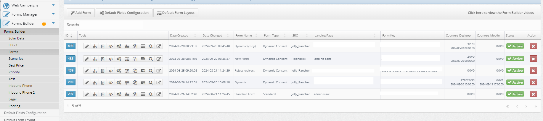 This will be explained more below, but there are also options for default field configuration and default form layout on the top of the page. Each form will also show when it was created, the last time a change was made, the form name, the lead type the form is used in, attached source, landing page, form key, form counters for desktop and mobile, an option to set the status active and inactive and an action to delete the form. When you hover over the counters for desktop and mobile, you will see your total views, pings and posts from that timeframe.