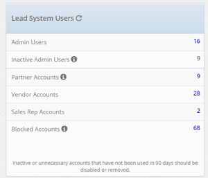 This section shows all of your users by groups in one standard place. You can select the number and have a new tab open that shows users of that type. This includes admins, partners, vendors and more. You can even see what accounts have been blocked from here as well! Pro Tip: Any users who are considered Inactive or Unnecessary should be disabled or removed. You can monitor that from the Inactive Admin Users count.