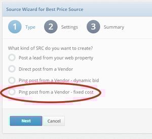 A new Source Wizard option was added to split the Ping Post from a Vendor use cases. We now have Ping Post from a Vendor fixed cost or dynamic bid. Dynamic bid is what Ping Post from a Vendor was before this update, but the new fixed cost option allows you to set a fixed price instead of the maximum best price.