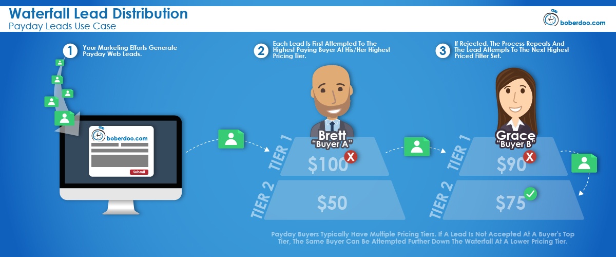 The logic explained above is the typical waterfall process for selling payday leads. However, boberdoo also offers an additional waterfall distribution option that takes advantage of an Earnings Per Lead calculation for each filter set for each lead buyer. Read about waterfall distribution by EPL here.